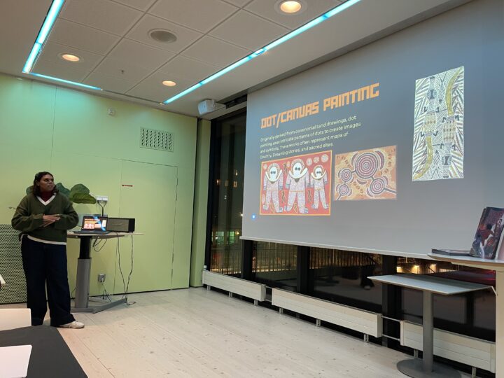 Under kvällen föreläste Molly om aboriginernas sätt att berätta och hur berättandet genomsyrar hela livet. Vi fick se bilder och video av traditionell konst, songlines och urtida grottmålningar. Molly visade även sina konstnärliga uttryck i tecknade serier och animerad film.